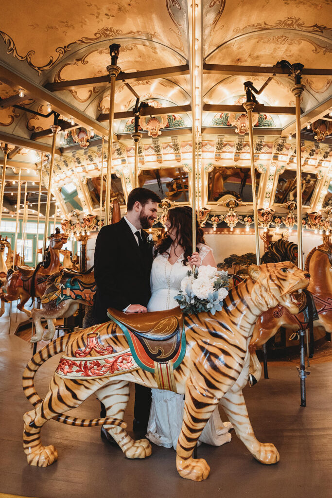 During cocktail hour, we snuck away with the couple’s family to get some portraits. Afterwards, I shooed everyone else away so Bill and Alora could have some time for just the two of them. I faded into the background and let them wander all over the park, pausing in some iconic locations (like the century-old carousel) to take their pictures! Though I could have spent the entire evening taking portraits, we returned to the reception space to introduce Bill and Alora as Mr. and Mrs.
