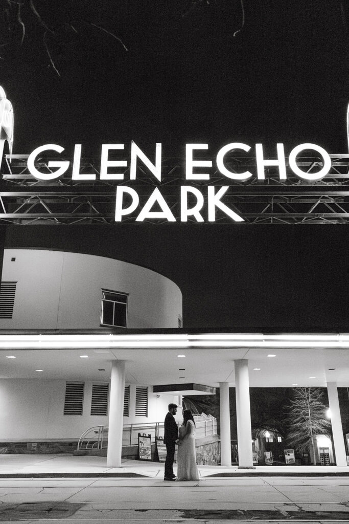 Glen Echo Park has turned the original bumper car pavilion into a reception hall, and it’s just as cool as it sounds. Equal parts chic and whimsical, the pavilion was the perfect backdrop for dinner, toasts, and dancing. We transferred the balloon arch from the ceremony space to right behind the sweetheart table, adding a fun pop to the space. After the sun set, I stole Bill and Alora away for some extra portraits. You can’t have an amusement park wedding and not take advantage of the neon lights! While it required me to mess with my settings to get the lighting just right, these photos are some of my favorites from the entire night.