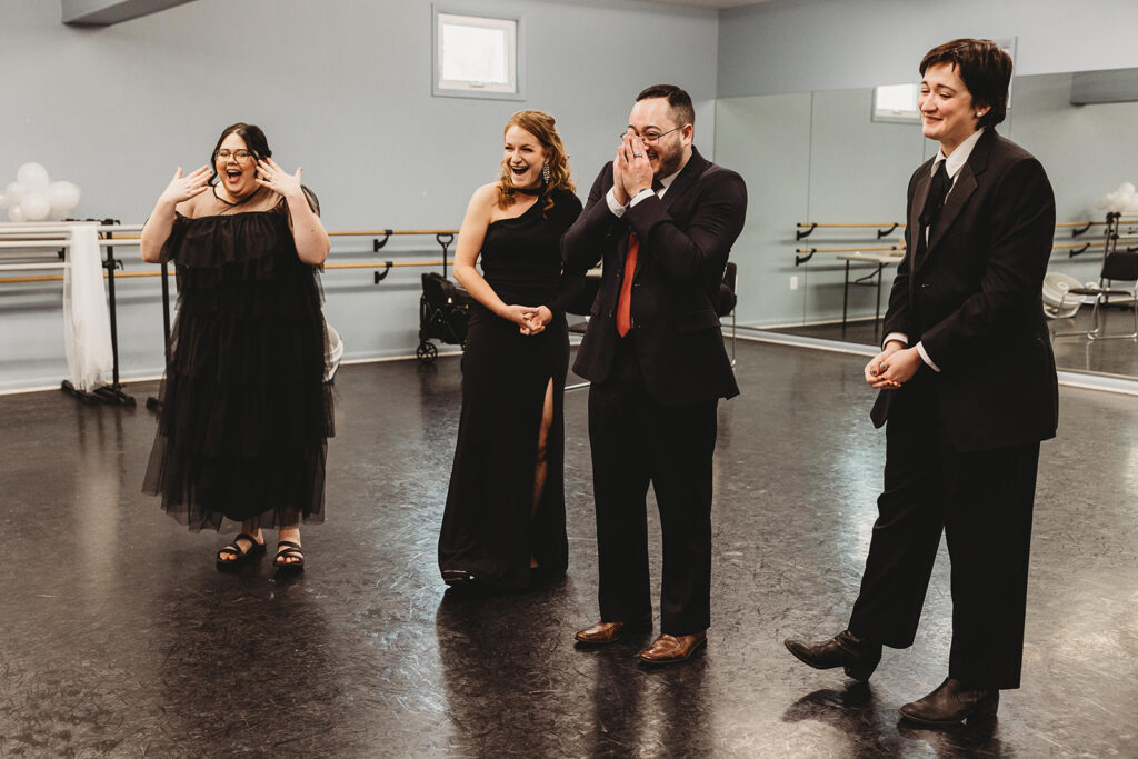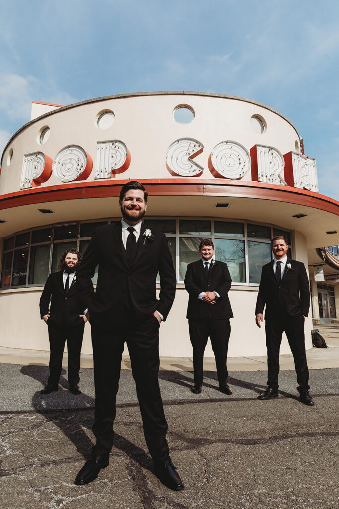 I got to know Bill and Alora during their engagement session a few months before their wedding. During that time, I fell in love with their sweet, intentional energy. That was only magnified throughout their wedding day. They each got ready with their closest friends, throwing tradition out the window and having anyone they wanted with them throughout the morning. I was obsessed with the sleek black dresses and suits paired with red accents. They matched the venue perfectly! We got some incredible photos around the park, taking advantage of the unique, colorful backdrops.